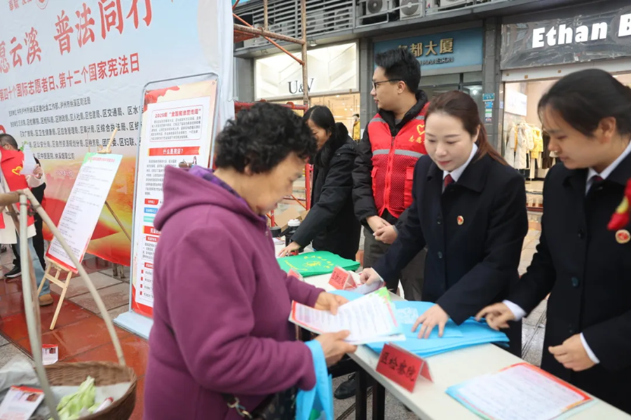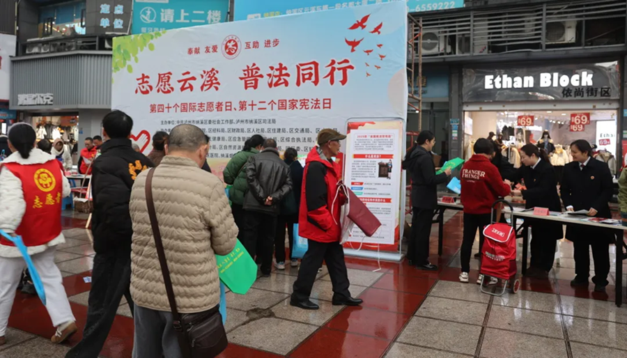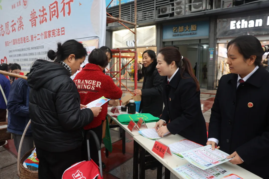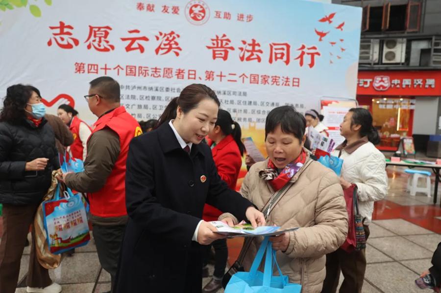 12月4日,在第十二个国家宪法日到来之际,为深入学习宣传习近平法治思想,大力弘扬宪法精神,纳溪区检察院“纳心”团队走进社区广场,开展“志愿云溪,普法同行”主题宪法宣传活动,让法治走到群众身边、走进群众心里。